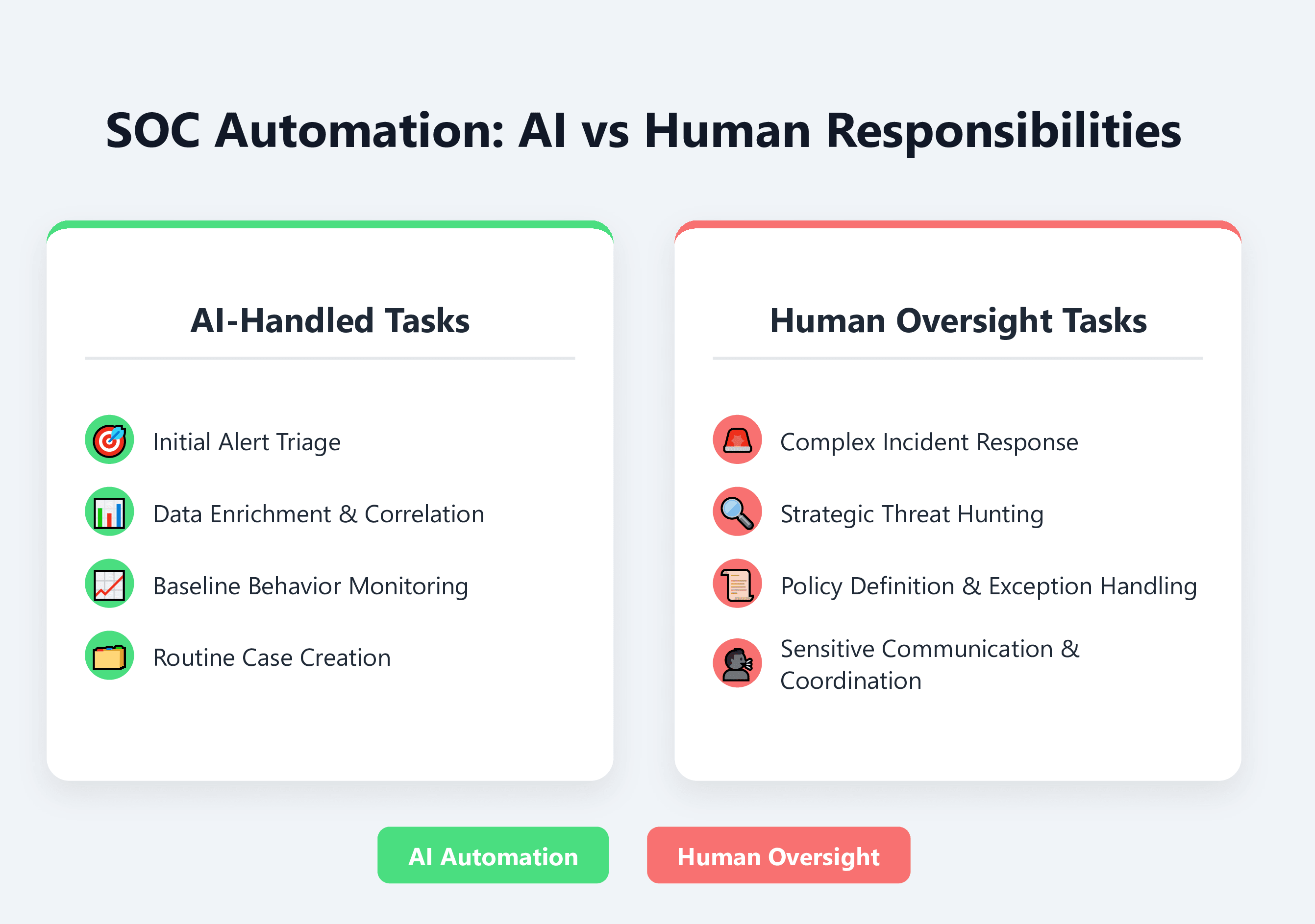 No. While AI can handle many human SOC tasks like initial triage and enrichment, human analysts are still needed for edge cases, quality control, and escalation decisions that require contextual judgment.