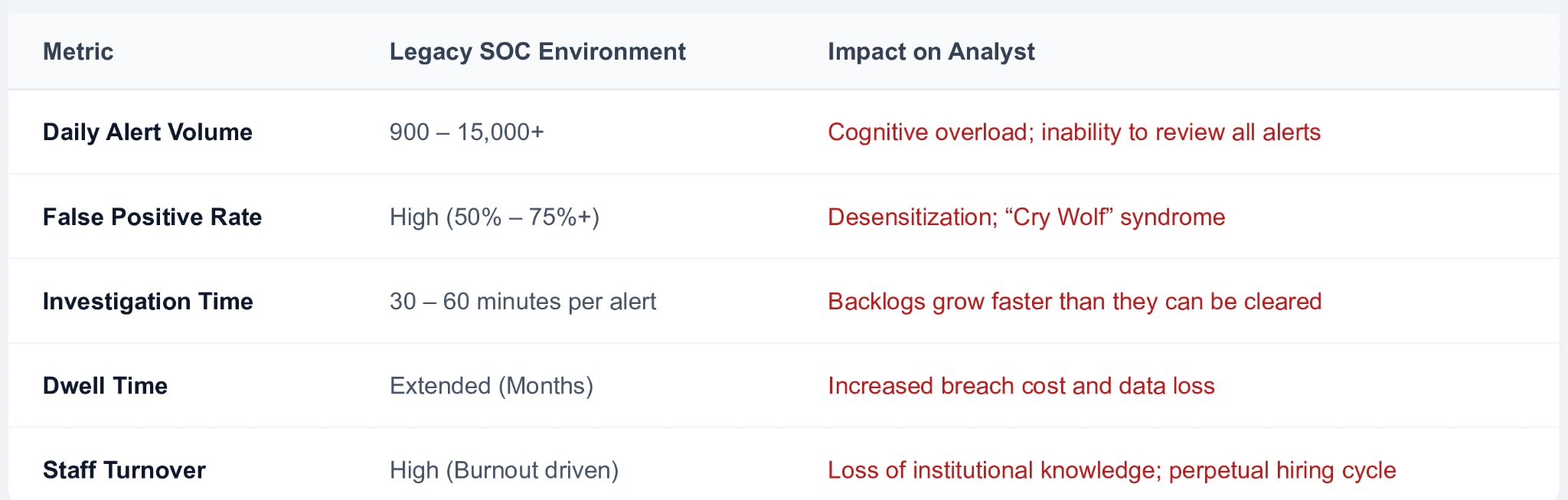 Capacity Expansion: AI-driven automation enables SOC teams to handle significantly higher alert volumes without proportional headcount increases, with some organizations achieving 70% automation of manual triage workload. This effectively triples the capacity of the SOC without the need to hire additional headcount.