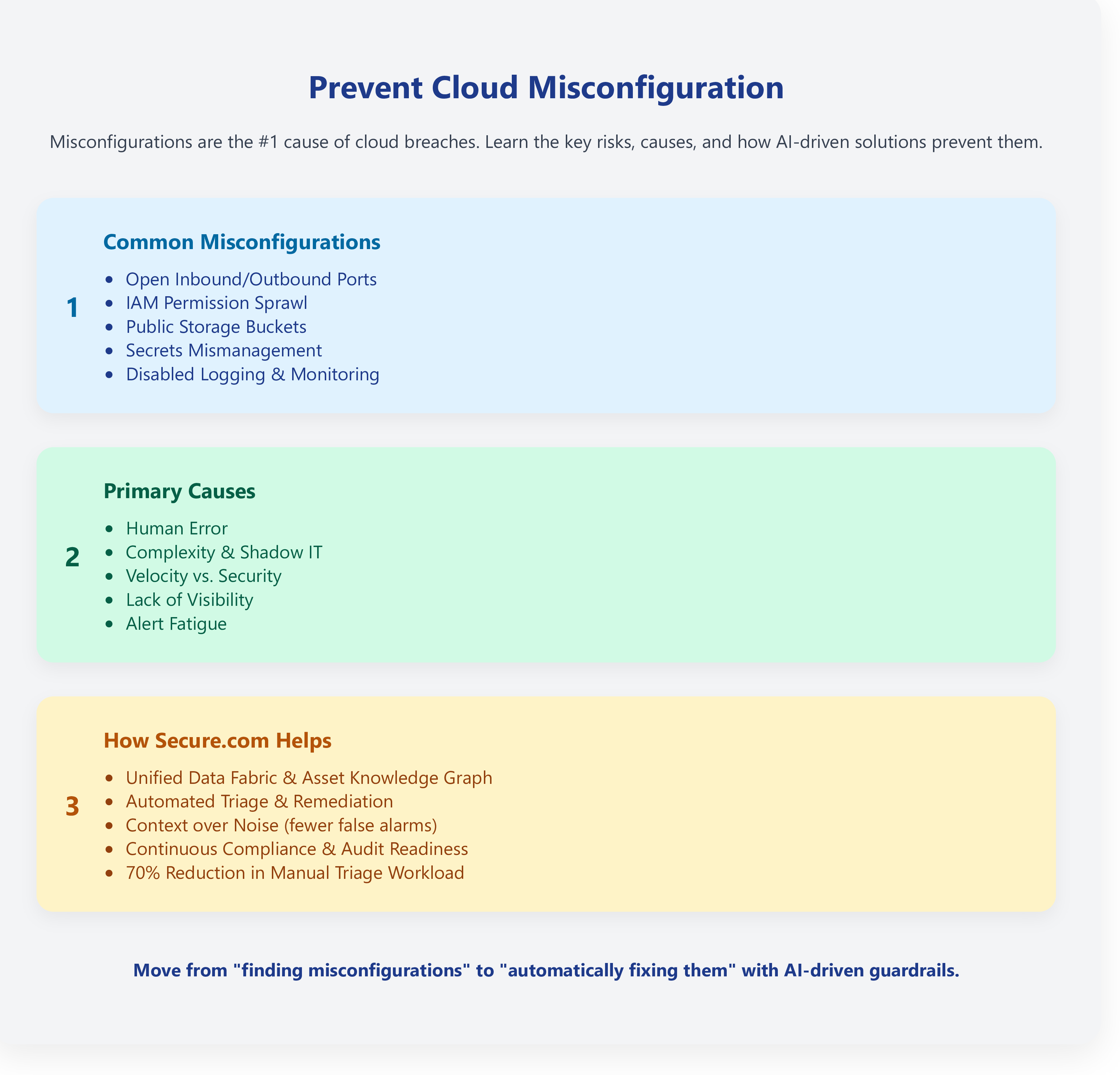 Cloud misconfiguration—not advanced malware—is the leading cause of cloud data breaches. It occurs when security settings (like storage buckets, firewalls, or IAM roles) are left on default or set up incorrectly. While traditional tools drown teams in alerts (many of them false positives), the solution lies in unified visibility, automated remediation, and AI-driven governance that catches drift before attackers do.