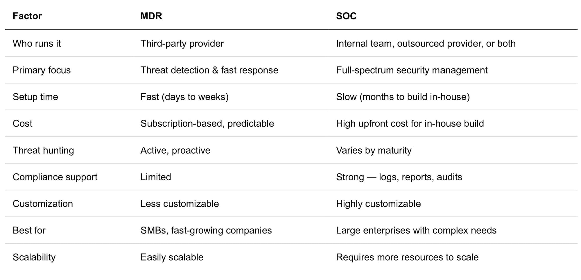 MDR is fast, outsourced, and built for organizations that need expert-level security without the overhead of building a full team. SOC offers broader control, compliance support, and deep customization — but it requires more time, money, and resources to run well.