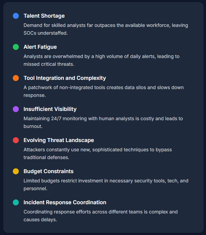 Traditional SOC teams spend so much time gathering context because their tools exist in silos, forcing analysts to pull information from separate systems manually. Each alert needs classification based on asset value, user behavior, threat intelligence, and historical incidents before SOC analysis. This manual process is slow and prone to errors, especially given the high volume of alerts most SOCs face daily.
