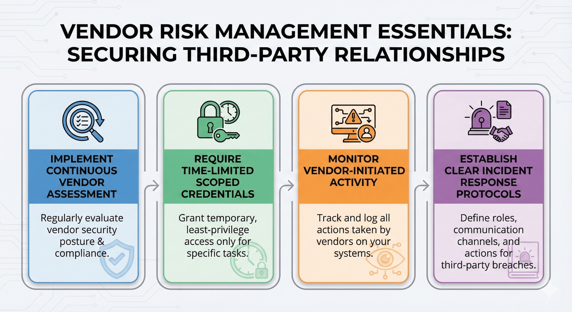 Implement continuous vendor assessment. Require time-limited scoped credentials, monitoring for vendor-initiated activity, and clear incident response protocols for third-party breaches.