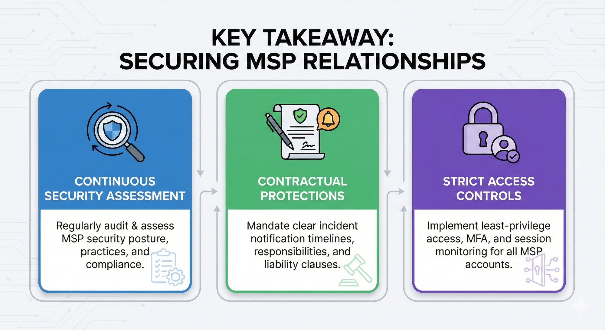 Key takeaway: MSP relationships require continuous security assessment, contractual protections for incident notification, and strict access controls following least-privilege principles.