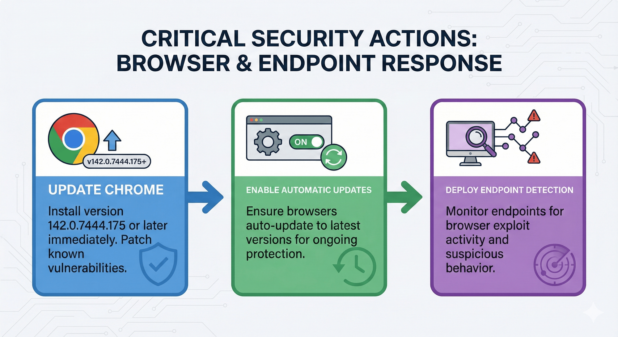 Critical actions: Update Chrome to version 142.0.7444.175 or later. Enable automatic updates. Deploy endpoint detection for browser exploit activity.