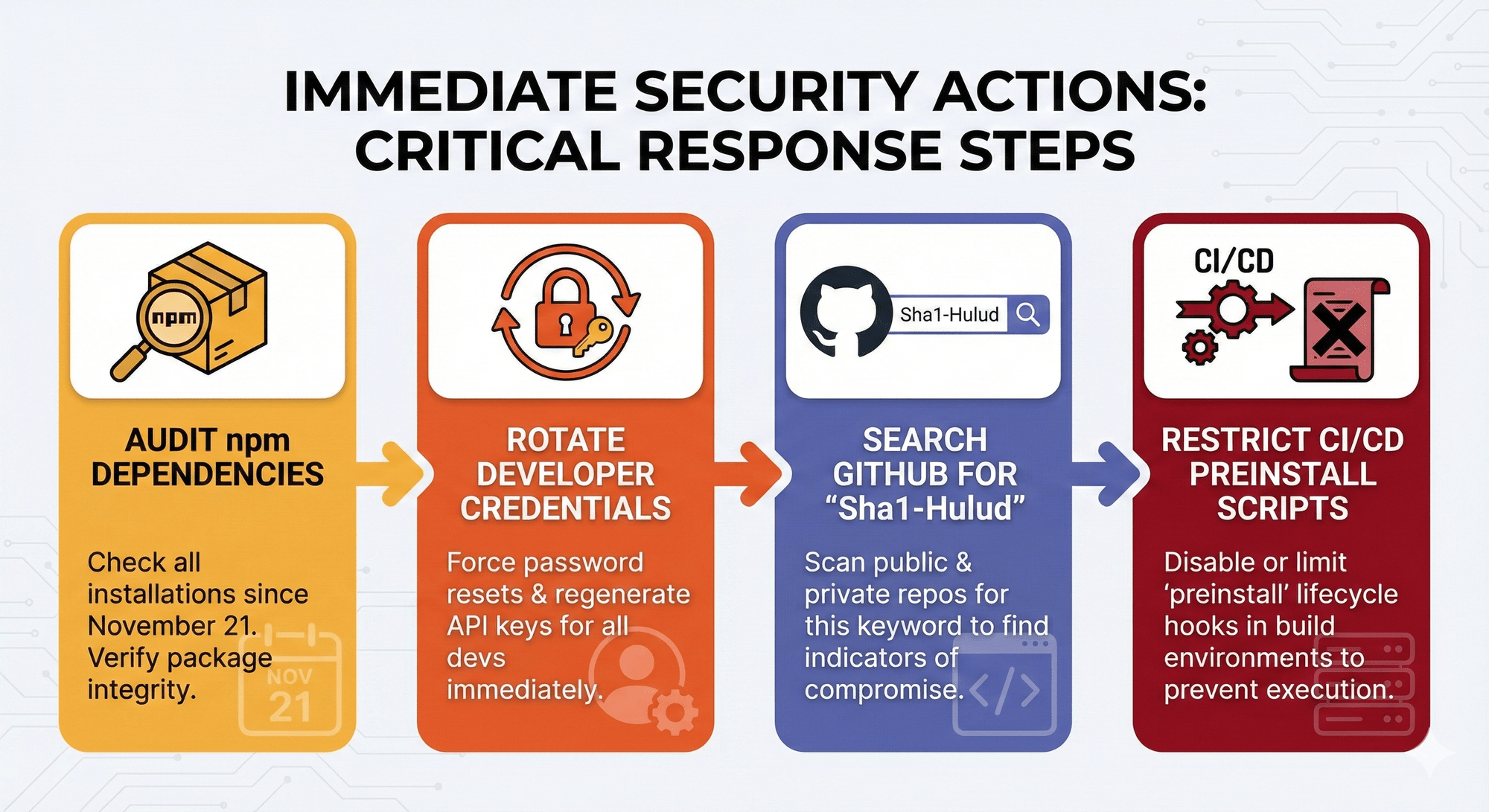 Immediate actions: Audit all npm dependencies installed since November 21. Rotate all developer credentials. Search GitHub for “Sha1-Hulud” repositories. Restrict preinstall lifecycle scripts in CI/CD environments.