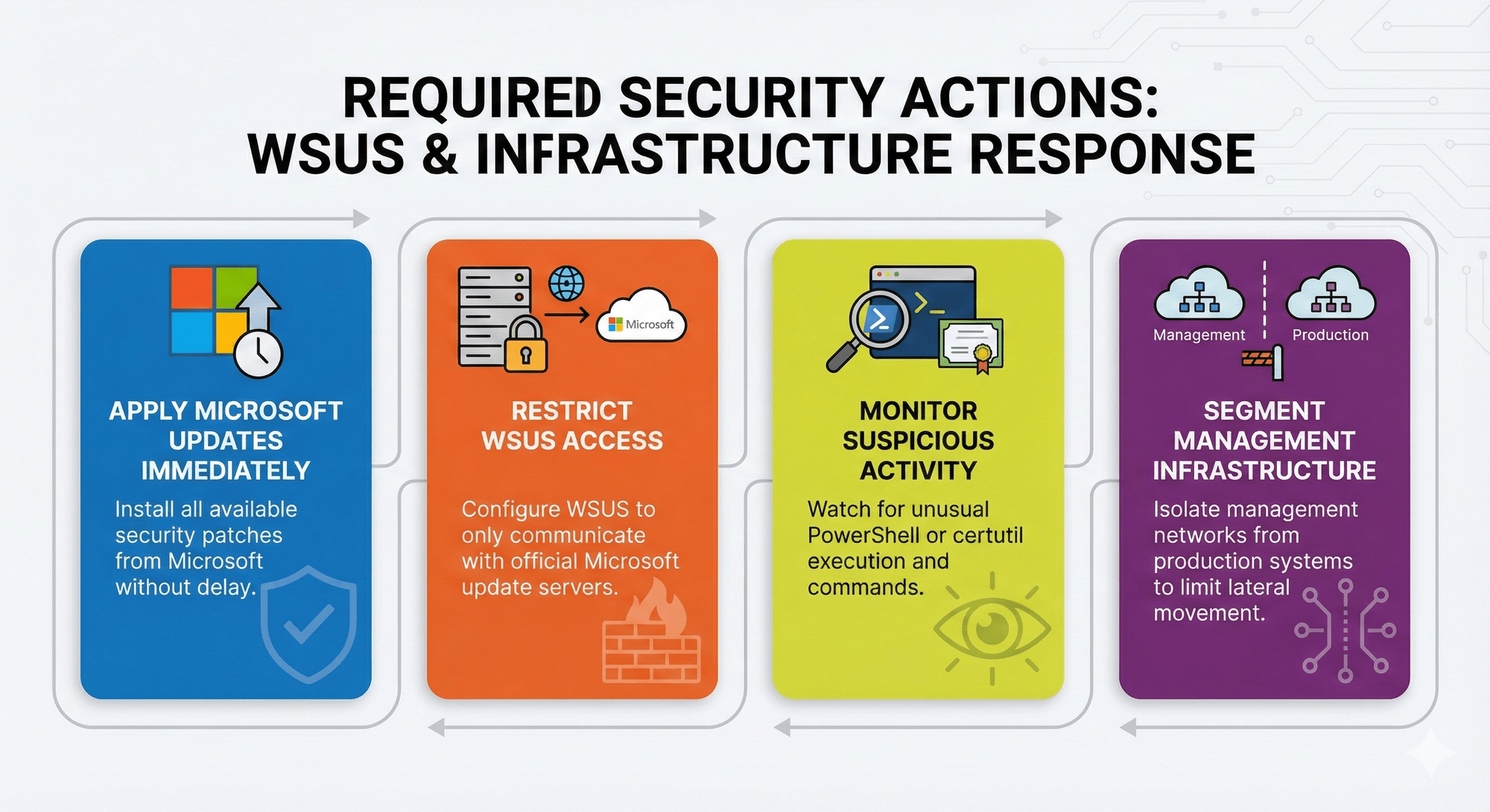 Required actions: Organizations should apply Microsoft updates immediately. There is also a need to restrict WSUS access to Microsoft servers only, monitor for suspicious PowerShell/certutil activity, and segment management infrastructure from production networks.