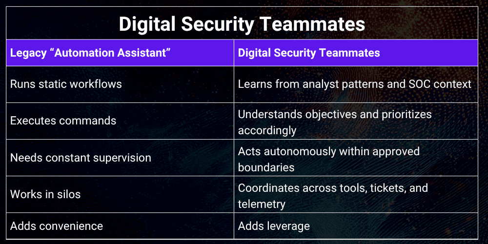 Traditional automation follows rules. Digital Security Teammates follow intent.