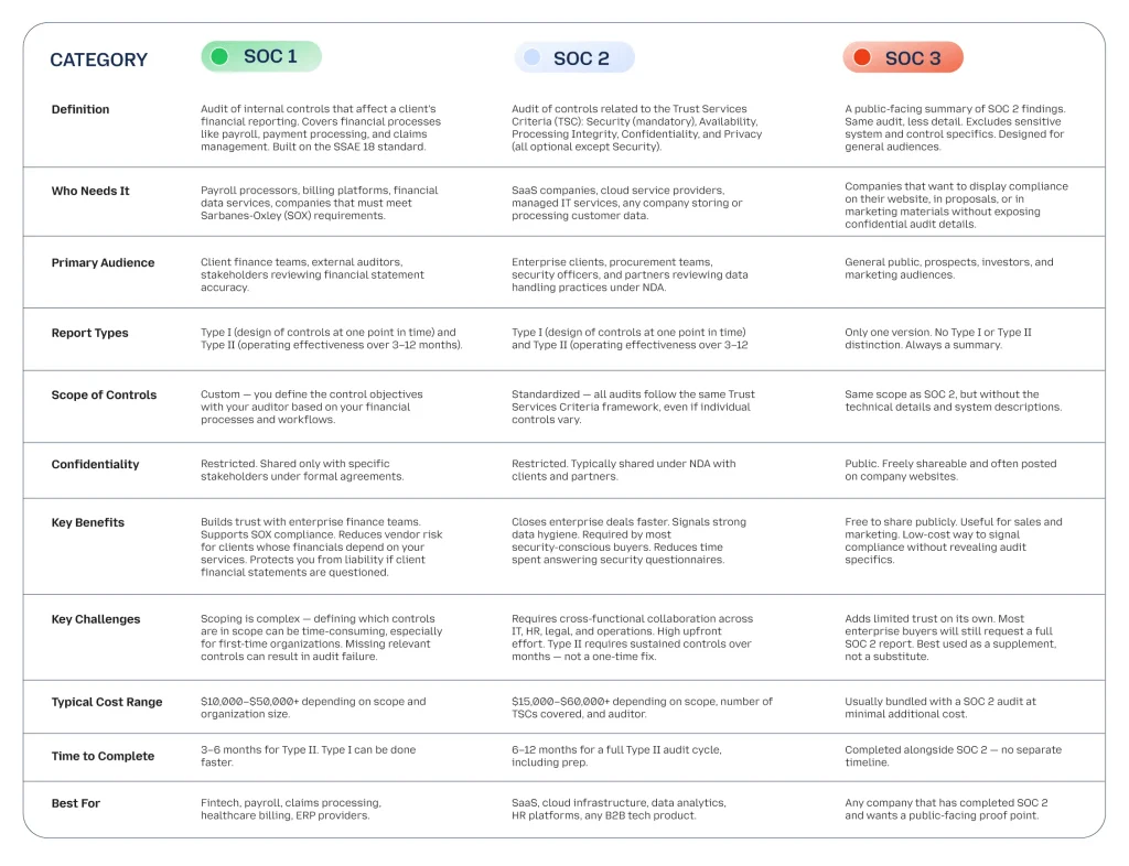 If your product touches a client’s financial reporting, get SOC 1. If you’re in SaaS or cloud services and want enterprise deals, get SOC 2 Type II. If you’ve already completed SOC 2 and want something to share publicly, add SOC 3 while you’re at it.