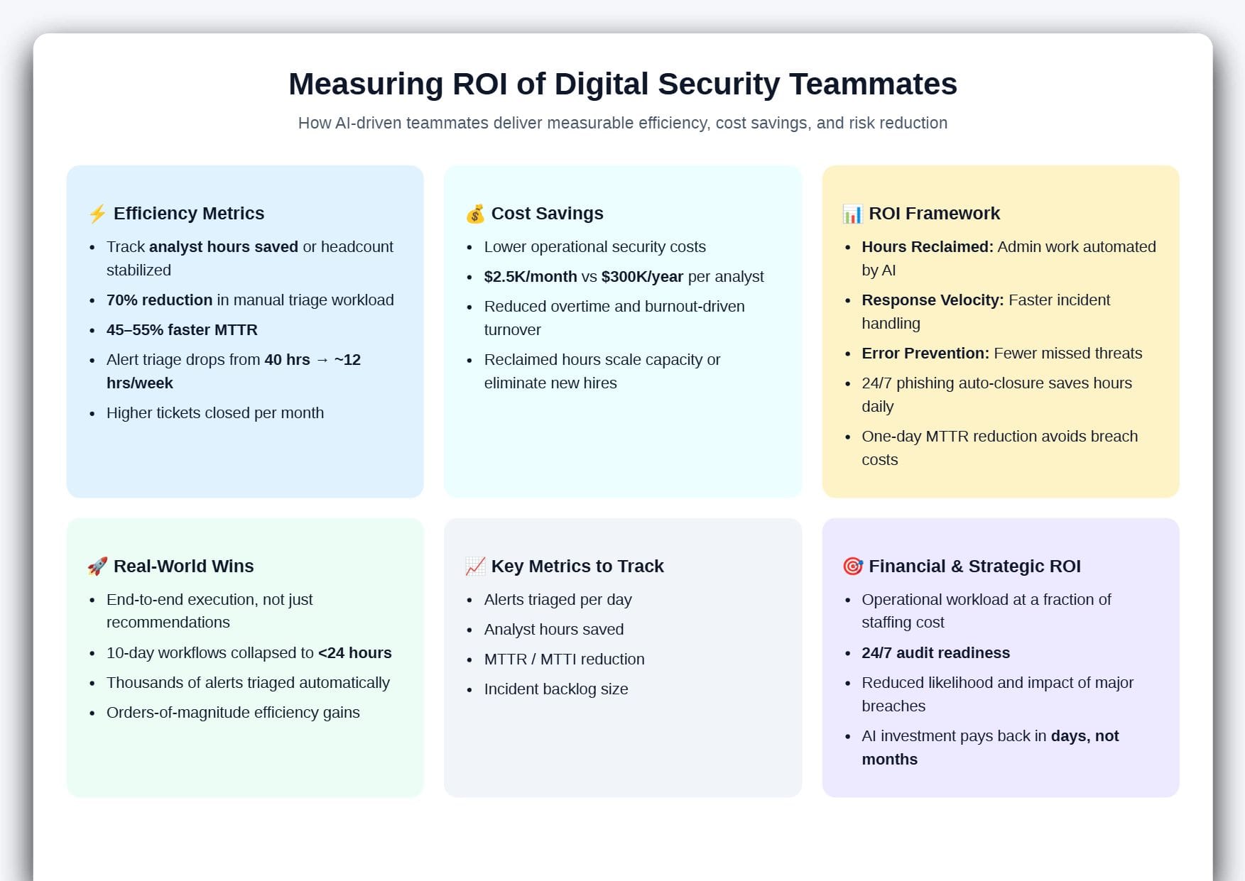 Discover how Digital Security Teammates are transforming cybersecurity operations, freeing analysts for high-value work and delivering clear return on investment.