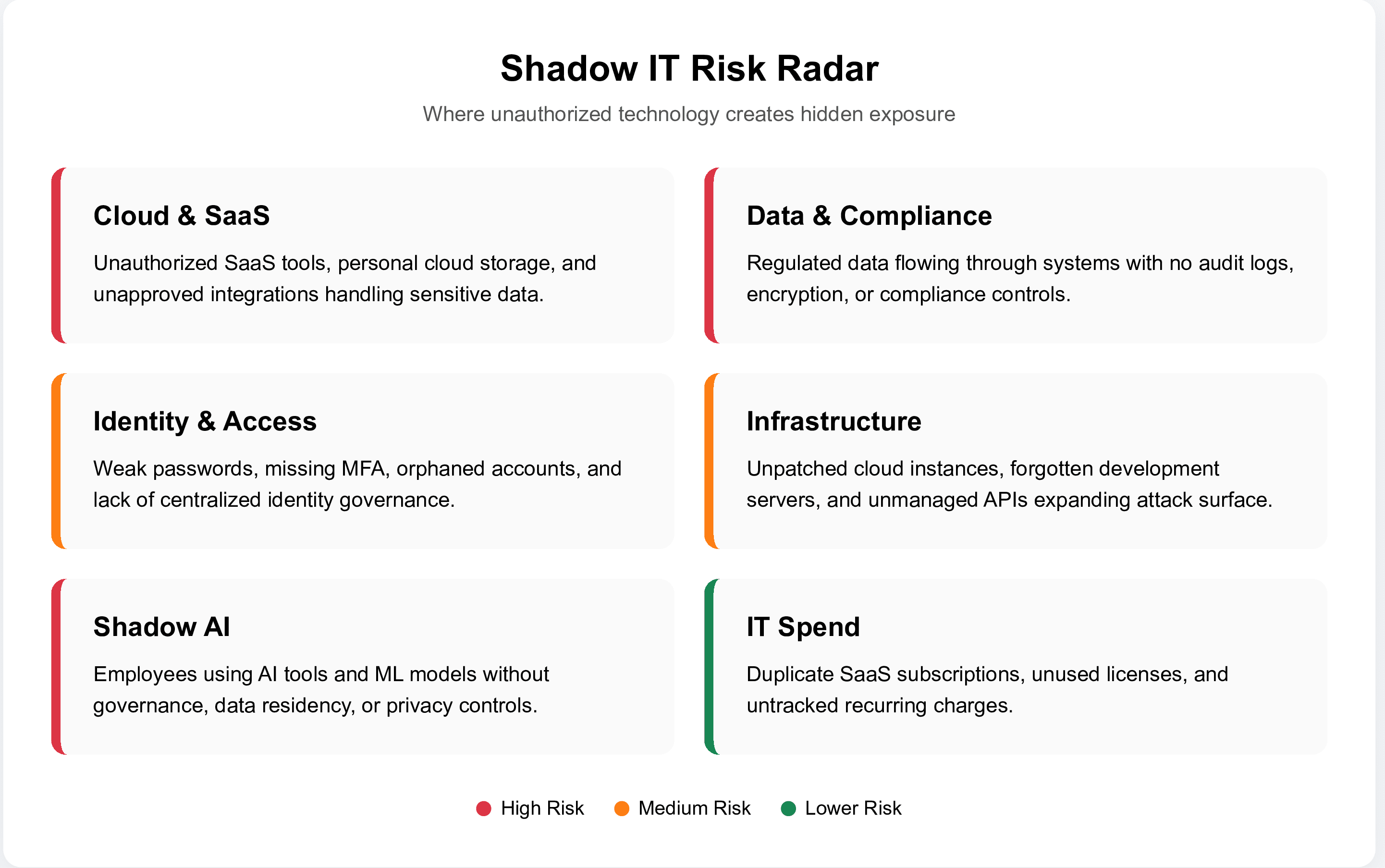 Automated risk scoring, continuous security monitoring, and orchestrated response workflows provide the visibility and control needed to manage shadow IT effectively. Organizations face a clear choice: accept shadow IT as an unmanaged attack surface, or implement discovery and governance that transforms employee-driven innovation into secure, approved capabilities.