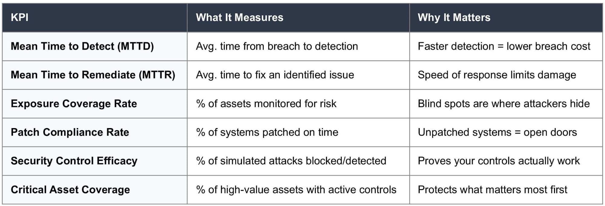 Two additional KPIs worth tracking: the number of critical exposures open past their SLA (shows operational breakdown), and the exposure reduction trend over time (shows whether the program is actually improving your posture month over month).