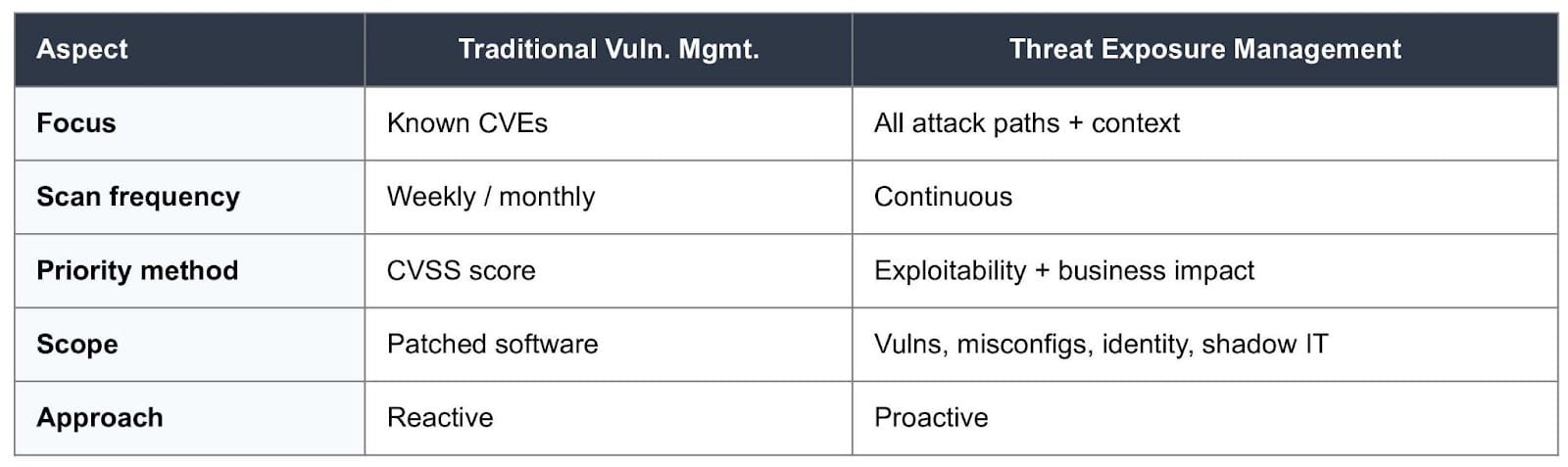 For a deeper breakdown of these two approaches, read our guide on exposure vs. vulnerability management.