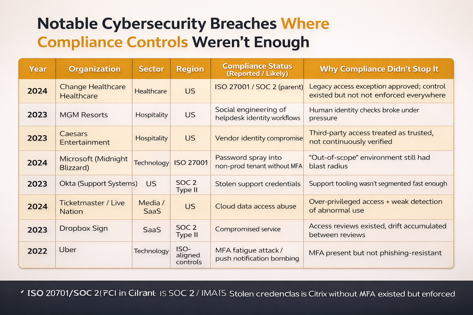 2022-2025 shows: compliance certifications don't prevent breaches. Change Healthcare, MGM, Microsoft, Okta, and Ticketmaster were ISO 27001 or SOC 2certified when compromised. The failure was in treating compliance as the finish line.